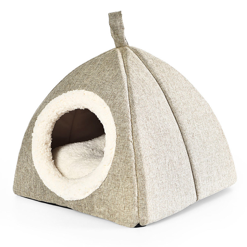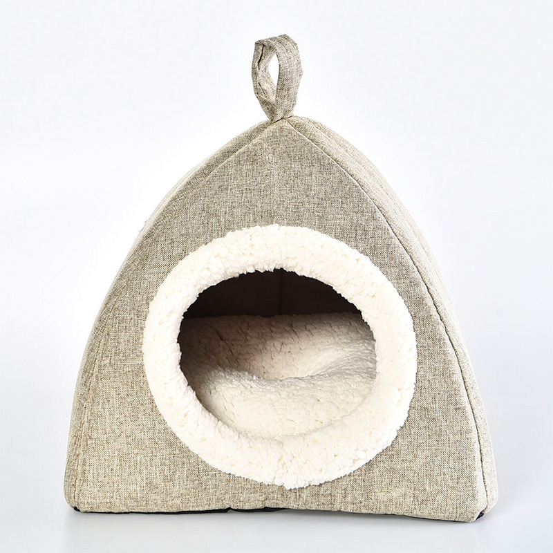 This pet bed is crafted from eco-friendly faux linen fabric, offering a soft yet durable texture with breathability for a comfortable resting experience. Its unique cave-like design provides kittens or small dogs with a secure, private sleeping space, helping reduce anxiety and stress. Lightweight and portable, the bed can be easily moved or taken on trips, making it ideal for travel and versatile indoor use. Its sleek, modern design seamlessly complements any home decor.