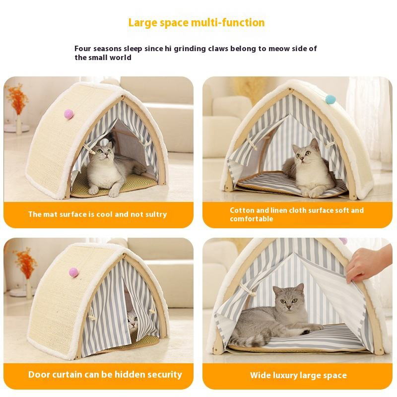 This pet bed features a high-quality solid wood frame and durable sisal material, serving as both a scratching post and a cozy resting spot. Its built-in sponge padding provides comfortable support for cats, while the square design ensures stability and durability for long-term use. The unique foldable design allows for easy storage and portability without taking up space. Suitable for all seasons, it offers breathability and wear resistance, effectively helping cats sharpen their claws, protecting furniture, and enhancing home living quality. Classic minimalist style with solid patterns that naturally complement any decor, combining eco-friendliness with aesthetic appeal.