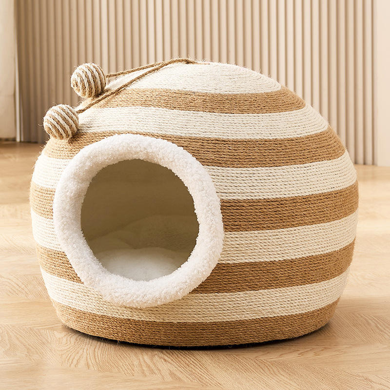 This pet bed is specially designed for cats, crafted from natural sisal material that combines eco-friendliness with durability. Its square, fully enclosed structure provides cats with a private, secure resting space while effectively blocking cold drafts to keep them warm in winter. The bed's surface is scratch-resistant yet allows cats to scratch naturally, satisfying their instincts and reducing furniture damage. The snap-button closure ensures easy access for pets while maintaining overall stability. The natural material offers excellent breathability, promoting air circulation inside to maintain a comfortable, dry environment.